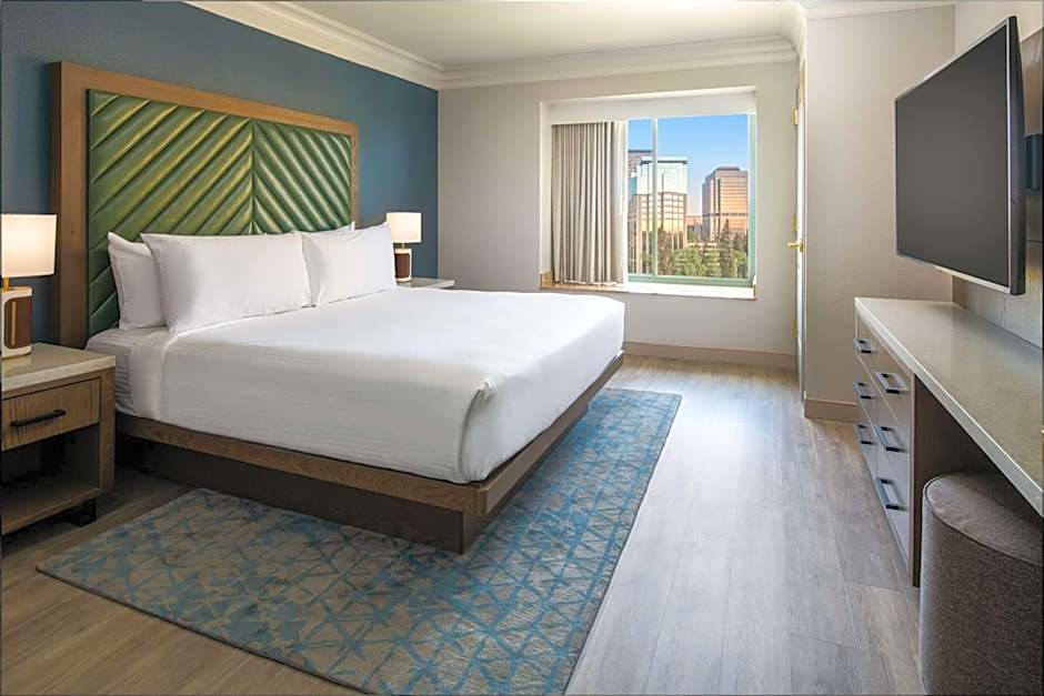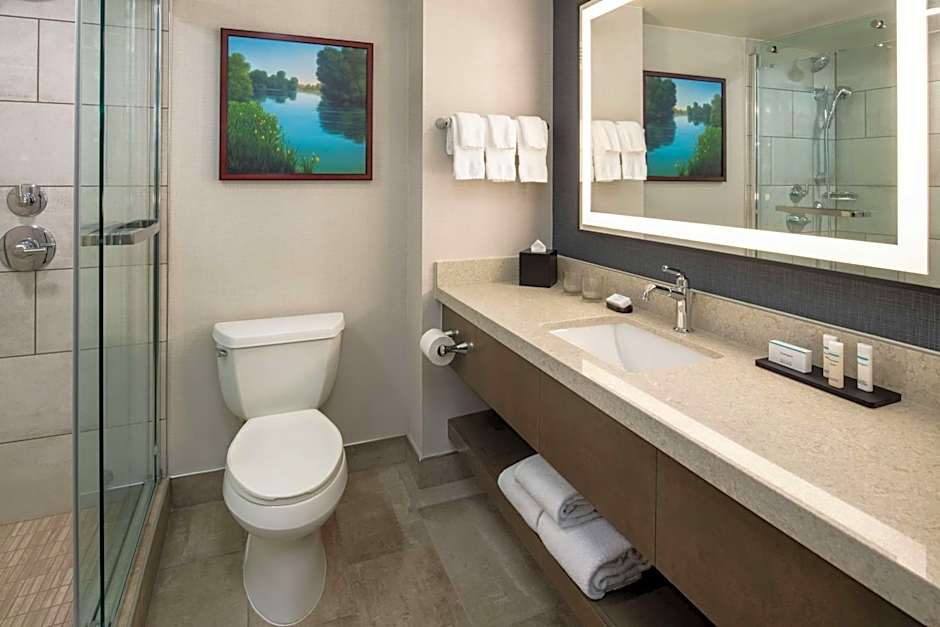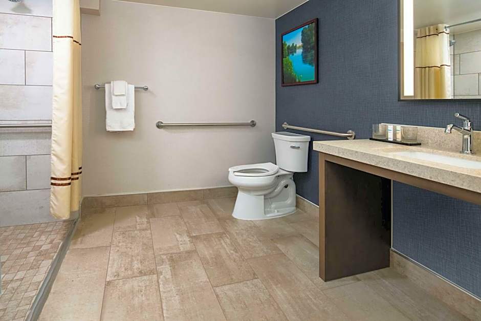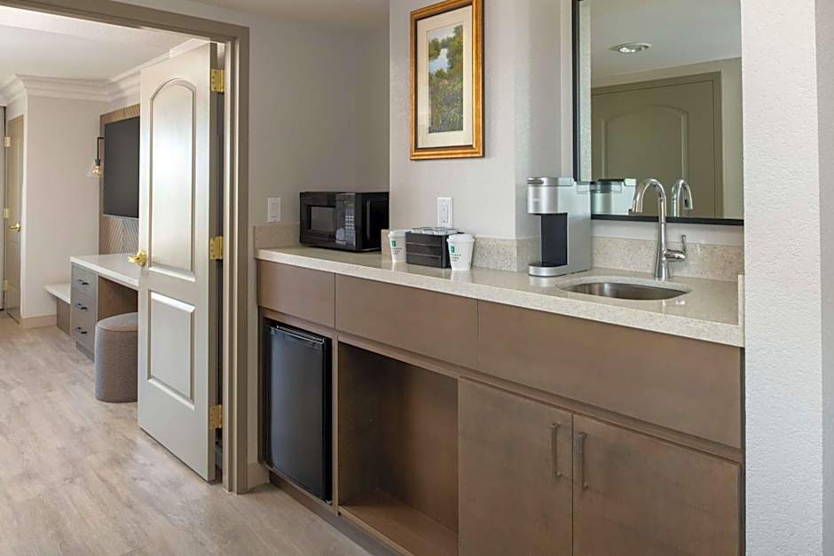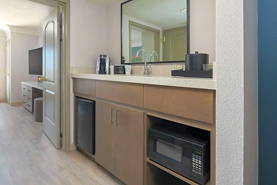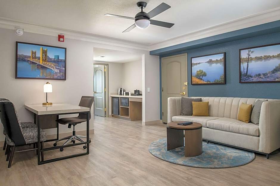 All of our suites include complimentary cooked-to-order full breakfast and Evening Reception featuring beer, wine, premium spirits and light snacks. This mobility accessible premium suite features one king-sized bed, and an accessible tub. Located on our Riverview side, this suite gives you the space and privacy you need for work or play on the road. Furnishings include sofa bed, armchair, activity table with upholstered chairs, beautiful bed linens, two 42-inch flat-screen televisions, alarm clock radio with MP3 connection, refrigerator and microwave oven. The bathroom features marble vanity and a tub with shower. Any corresponding photo may not reflect the specific accessible room type or room feature.